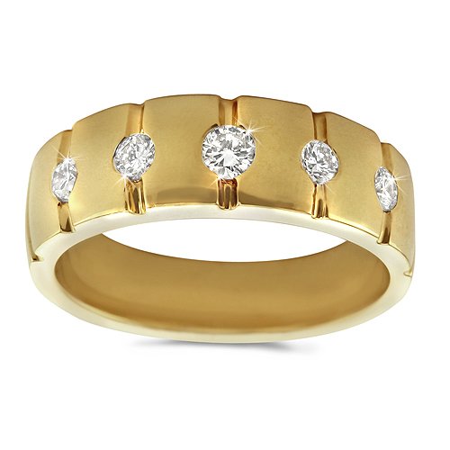 A ring made for the confident man. Five VS1-VS2, near colorless, round-cut, bezel-set diamonds are perfectly lined up to showcase elegance on a mans hand. All in 18k yellow gold for a timeless band that will never go out of styleAvailable at Amazon Check Price Now!